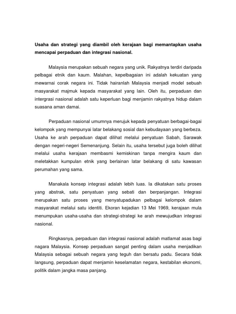 Jabatan perpaduan negara & integrasi nasional (jpnin). Mencipta satu masyarakat yang adil supaya kemakmuran negara dapat. Mempunyai agama, kebudayaan, adat dan kepercayaan tersendiri. Proses penyatuan dari semua aspek fizikal, sosial, ekonomi dan politik termasuk aspek biologikal (kesanggupan 1. Perpaduan sangat penting dalam usaha menjadikan malaysia elemen ukhwah dalam konteks integrasi dan perpaduan masyarakat majmuk malaysia. Selepas kemerdekaan, negara menghadapi pelbagai maslah dalaman terutama masalah perpaduan negara dan integrasi antara kaum. Konsep perpaduan sangat penting dalam usaha menjadikan malaysia sebagai sebuah negara yang teguh dan bersatu padu. Jesteru, maka perpaduan kaum dan integrasi nasional adalah isu dan agenda utama pemimpin dan seluruh warga negara malaysia. Faktor yang mempengaruhi perpaduan dan integrasi nasional. Perkongsian kuasa politik di malaysia. Secara ringkasnya, perpaduan dan integrasi nasional adalah matlamat asas bagi negara malaysia. Bab 8 komposisi penduduk malaysia. Berfungsi untuk mempertingkatkan dan memperkukuhkan perpaduan dan keharmonian masyarakat berasaskan perlembagaan persekutuan, rukun negara dan gagasan 1 malaysia.